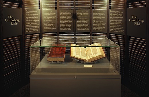 El Centro Harry Ransom de la Universidad de Texas en Austin contiene una copia de lo que muchos consideran el libro más valioso del mundo. La Biblia de Gutenberg no sólo es el libro más antiguo que se imprimió con tipos móviles, sino también el primer libro completo que se produjo con esa tecnología. El volumen en la Universidad de Texas es una de las 20 copias completas que han sobrevivido.Aunque su valor es meramente especulativo, ya que ha sido casi 40 años desde la última venta de una copia, no hay duda de que si se pone en el mercado hoy en día, estaría rompiendo todos los registros existentes. (La edición en el Centro Harry Ransom fue comprada en 1978 por $ 2.4 millones.) Al examinar la historia del cristianismo en 25 objetos históricos, la Biblia de Gutenberg representa su gran contribución a la historia de la imprenta de tipos móviles.