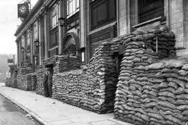 Y entonces, un día de mayo de 1940, después de nueve meses de casi ninguna acción … algo siniestro se produjo en Londres: los sacos de arena, que habían fortificado las paredes de los edificios del gobierno, todos comenzaron espontáneamente a estallar.