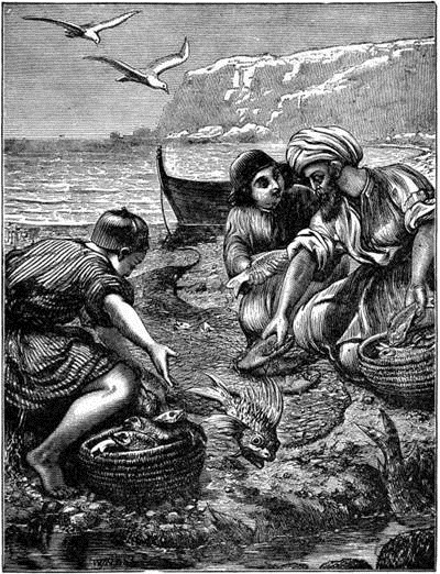 – El buen pescado (los creyentes verdaderos ciudadanos /) y los peces malos (incrédulos / ciudadanos falsos) aparecen juntos en la red (probablemente la iglesia) y se separan al final de la epoca en que los peces buenos se empacan y los peces malos se queman.