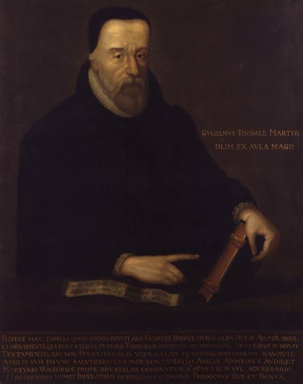 Un lugar destacado en mi estudio, como si estuviera mirando por encima de mi hombro derecho, está una reproducción de un retrato imponente del gran traductor de la Biblia William Tyndale . Pintado al óleo sobre lienzo, la obra original es del pincel de un artista desconocido. Se realizó a finales del siglo XVII o principios del XVIII, y ahora se exhibe en la Galería Nacional de Retratos de Londres. Como el tema del retrato, Tyndale está sentado, vestido todo de negro, y rodeado de un fondo de color marrón oscuro tenue. Su cara y sus manos parecen brillar intensamente de la luz de una vela que se oculta a la vista.
