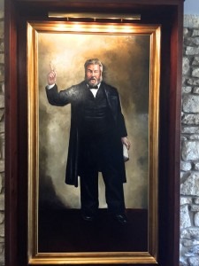 En realidad, yo estaba allí principalmente por el hecho de ser el marido de Caffy. Ella había sido comisionada para pintar retratos de tamaño natural tanto del Spurgeon joven y del maduro para la colocación en la entrada de la biblioteca. ¿Se me permite decir que estos son realmente buenos? Puedes verlos en diversas etapas de desarrollo en la página de Facebook para su estudio de arte. También en esa página está un retrato de George Whitefield que cuelga en la oficina del Presidente Allen.