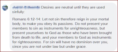 Me referí al Tweet de TGC como un “sofisma confuso y engañoso” y agregué: “Codiciar algo pecaminoso no es obediencia a Dios.” Siguió una larga discusión, con varios amigos en mi página de Facebook y muchos de mis Twitter seguidores que expresaban conmoción y sorpresa de que yo tuviera una opinión tan fuera de lugar con la corrección política posmoderna. La opinión postmoderna «correcta» fue expresada de manera sucinta por un comentarista exasperado en mi página de Facebook: “Los deseos son neutrales hasta que sean usados pecaminosamente;” escribió.