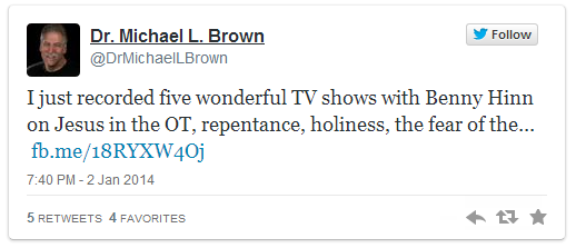 (Texto completo en Facebook = “Acabo de grabar cinco maravillosos programas de televisión con Benny Hinn sobre Jesús en el Antiguo Testamento, el arrepentimiento, la santidad, el temor del Señor, y la hiper-gracia. Están programados para salir la semana del 13 de enero, así que cuidado con ellos y luego comparta sus pensamientos.”)